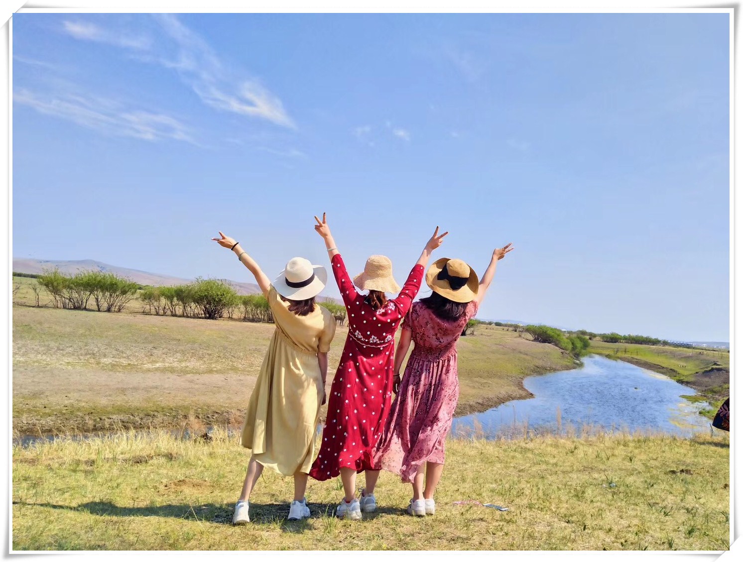 次日,欣賞著(zhù)沿途的風(fēng)景,我們驅車(chē)來(lái)到了老舍筆下的“天下第一曲水”——莫日格勒河。對于見(jiàn)慣大江大河的江南人來(lái)說(shuō),這里的河更像是渠,河道狹窄,彎彎曲曲,潔凈的河水歡快地流淌在草原之上,滋潤著(zhù)河邊的綠植。因為今年是旱季,草原沒(méi)有想象中的翠綠,但絲毫沒(méi)有影響大草原的遼闊和壯美。大家盡情地在草原上撒歡,像是一個(gè)個(gè)大孩子,充分享受著(zhù)粗狂式的自由和灑脫。